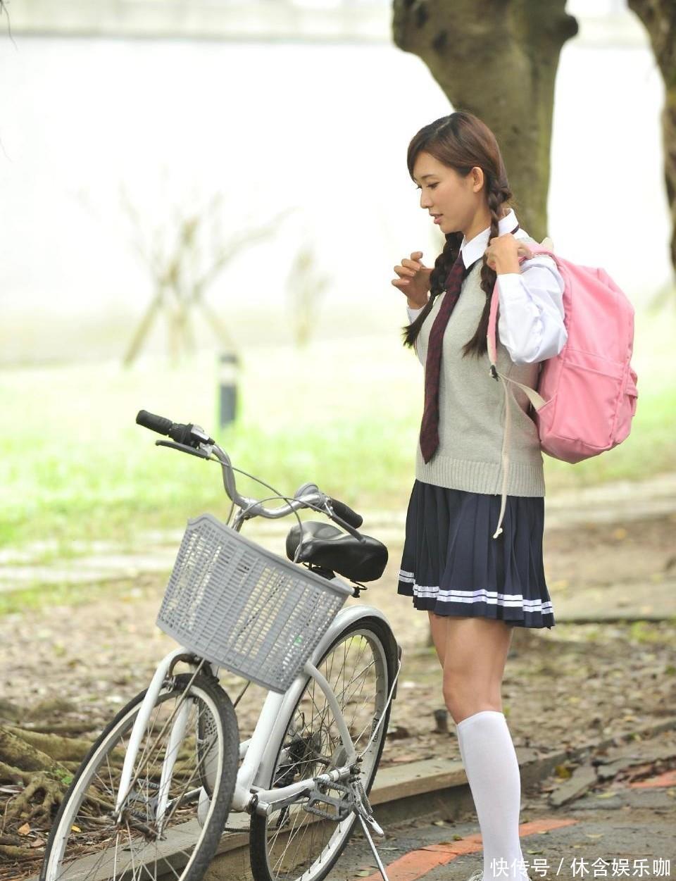 旁边的红色跑车和单车形成鲜明对比,反倒衬得她的校服造型更有画面感了。