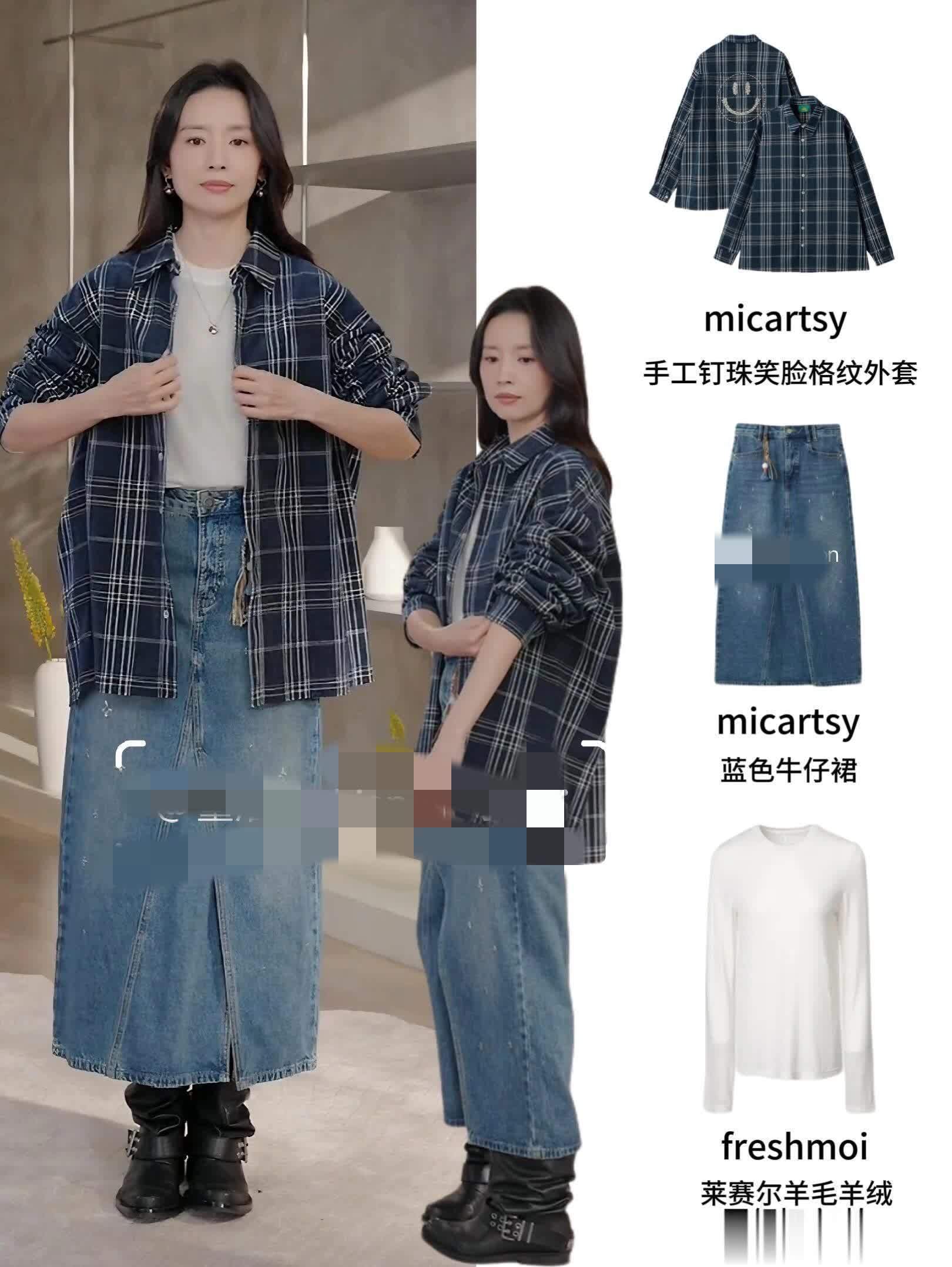 上宽下窄:她常常选择宽松的廓形毛衣、衬衫或外套,搭配修身的直筒牛仔裤、微喇裤或半身裙,通过廓形的对比,既能藏住上半身的肉感,又能凸显腿部线条的利落。